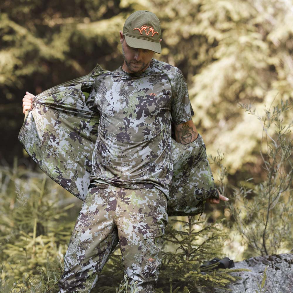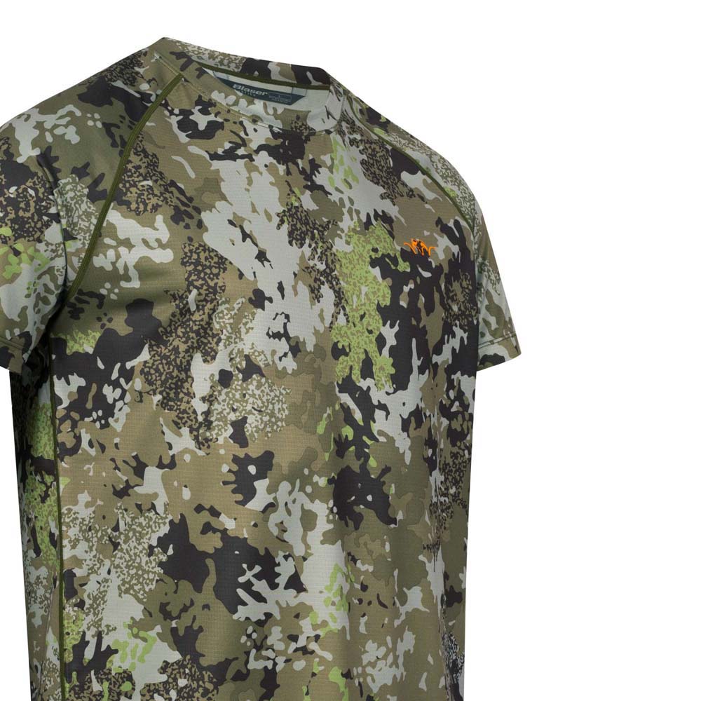 Das Blaser Tech T-Shirt 23 kurzarm aus schnelltrocknender Superfaser gehört als Basic in jeden Kleiderschrank. Es ist ein tolles Rundhals kurzarm T-Shirt mit großer Funktionalität! Die 3D-Struktur der Innenseite nimmt Feuchtigkeit auf und transportiert diese zügig nach außen. Auf der glatten Oberfläche des technischen Baselayers trocknet die Feuchtigkeit extrem schnell ab und sorgt so für einen angenehm kühlenden Effekt. Das Shirt ist verfügbar in den Farben Dunkel Oliv und HunTec Camouflage. Bei der einfarbigen Variante wurde das Garn durchgefärbt; dadurch entsteht der ansprechende Melange-Look. Das HunTec Camo hingegen wurde im Nachhinein bedruckt. Das Ergebnis: eine etwas glattere Haptik mit dezentem Glanz. Weich und angenehm zu tragen – Must-Have!