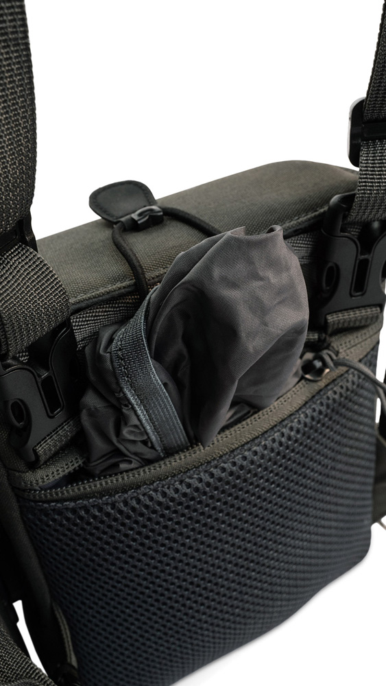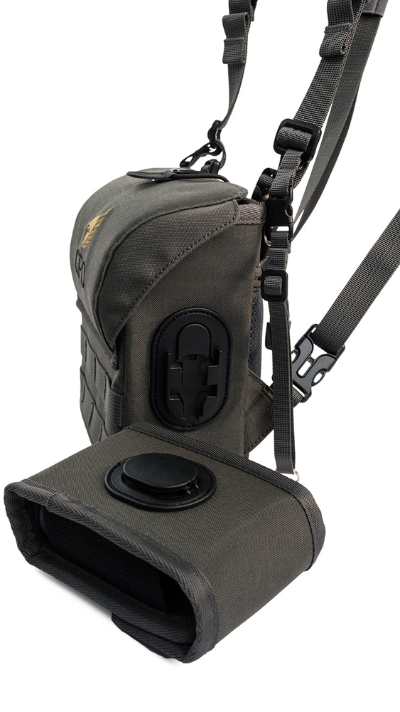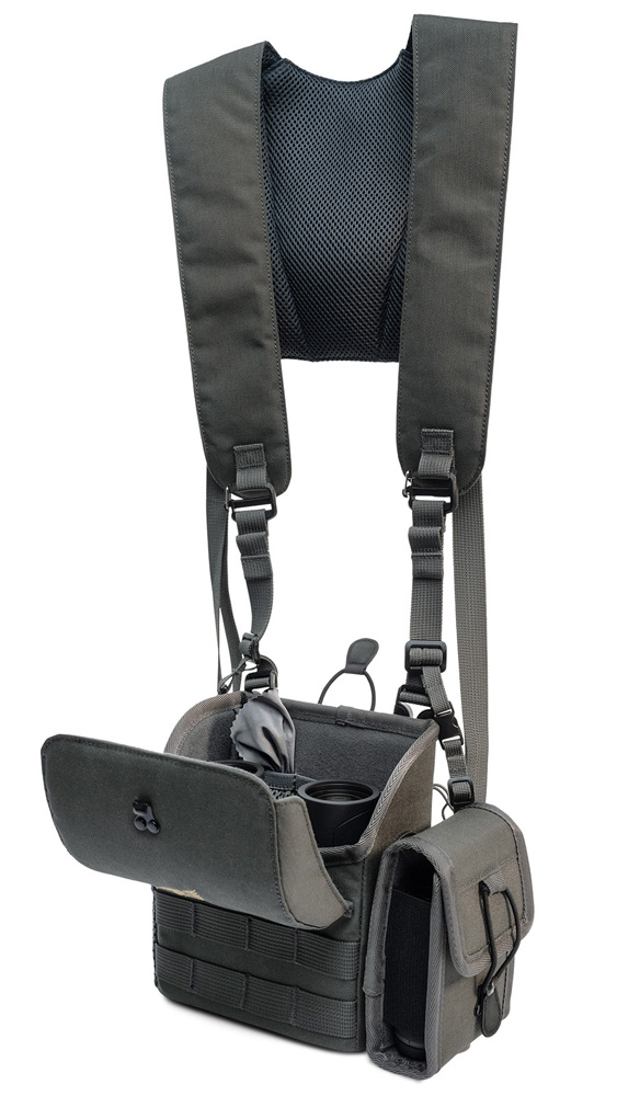 Der Fernglasbehälter bleibt stets griffbereit am Oberkörper, ohne zu baumeln oder zu pendeln